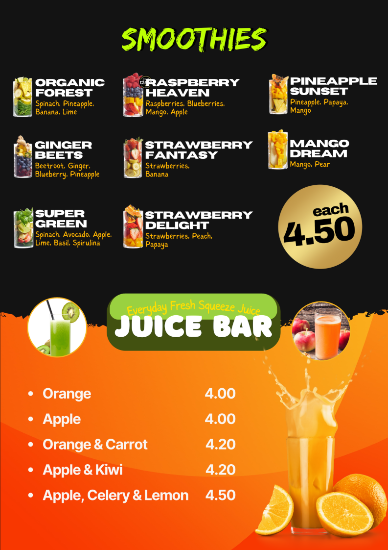 The drink menu is equally impressive, featuring an array of options including the classic Caffe Latte and Mocha, both priced at £2.80. Start your day with a creamy cappuccino or some refreshing herbal tea, all expertly brewed to perfection. As you sip your drink, you'll feel the worries of the day melt away amidst the buzz of happy diners and the harmonious hum of conversation.